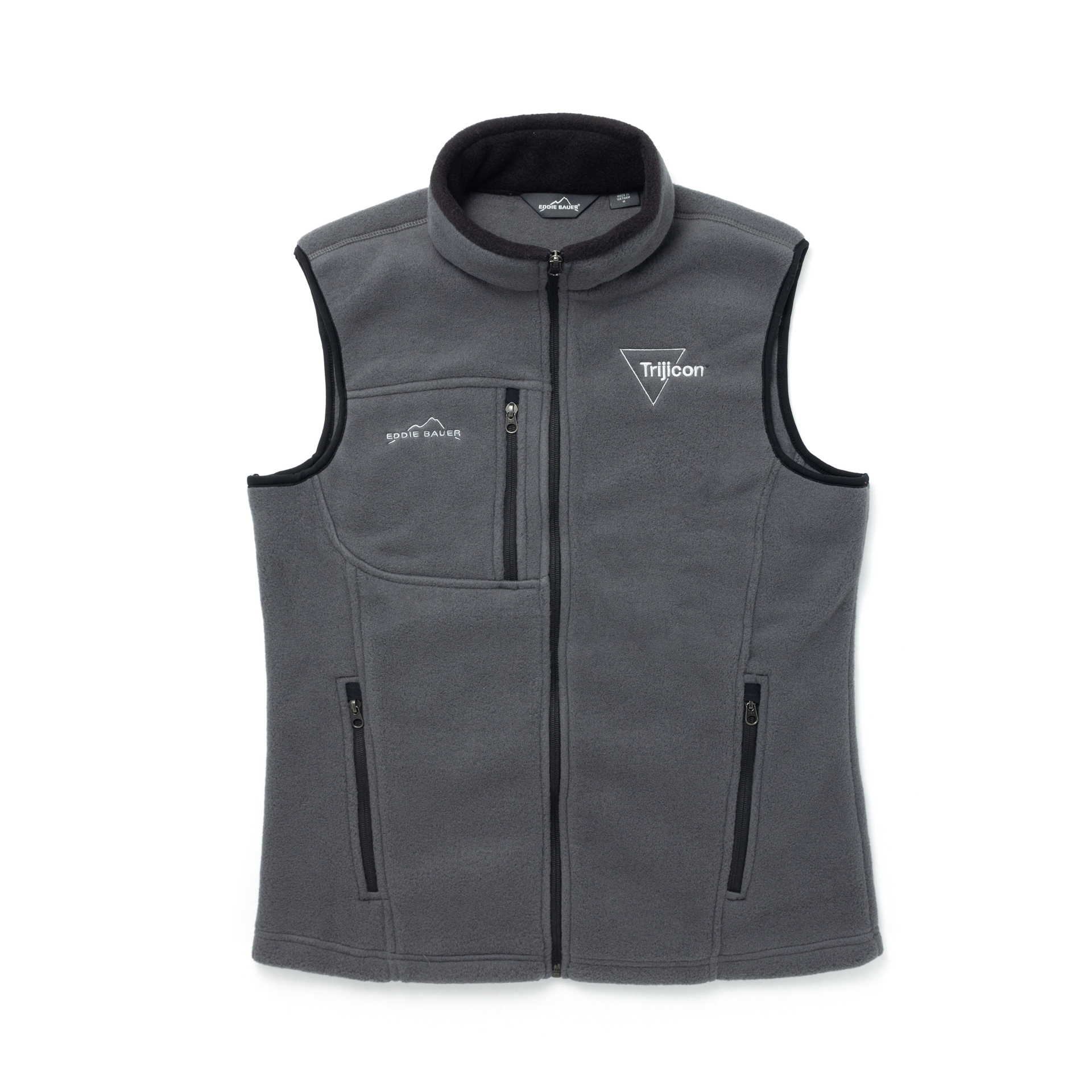 Seams dyed-to-match reverse coil zippers, front zippered pockets with tricot lining, binding at armholes and an open hem. Embroidered Eddie Bauer contrast logo on right hem. Made of 6.9-ounce, 100% polyester fleece. Produced using Low Impact Technology (L.I.T.) which uses less dyestuffs, thermal energy and water for enhanced softness, performance and after-care quality.